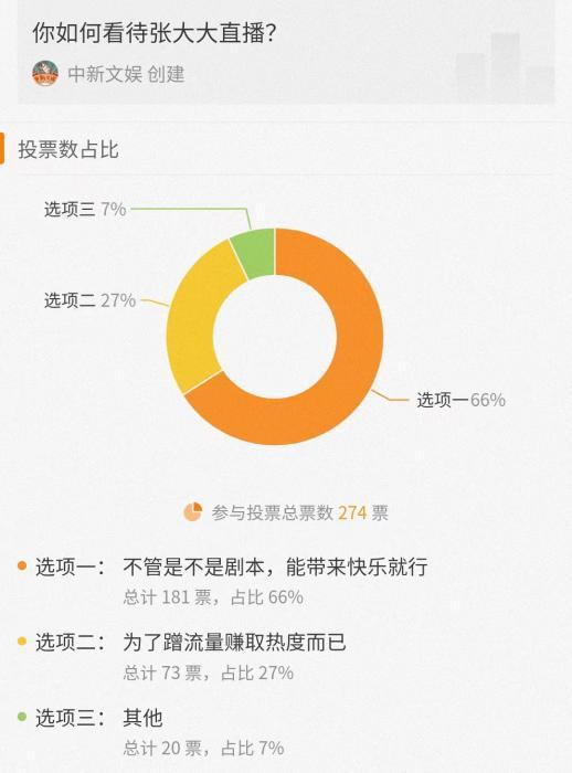 根据中新文娱发起的#你如何看待张大大直播#投票,66%的网友选择“不管是不是剧本,能带来快乐就行。”只有27%的网友认为张大大是在蹭流量赚取热度。