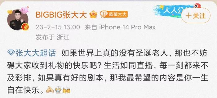 对于剧本的猜测,15日,张大大回应说:“如果世界上真的没有圣诞老人,那也不妨碍大家收到礼物的快乐吧?生活如同直播,每一刻都来不及彩排,如果真有好的剧本,那我最希望的内容是你一生自在快乐。”