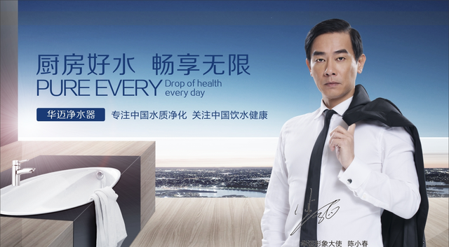 1、华迈净水器,陈小春代言。2016年11月8日,影响了几代人的“山鸡哥”陈小春倾情“加盟”华迈净水器,接力两届金像奖影帝肥猫郑则仕,正式担任华迈净水器品牌形象大使。 敢爱敢恨的山鸡形象深入人心,是80后、90后这一代人心中最珍贵的回忆,拥有成千万的拥趸者,华迈此次斥巨资请其为品牌代言,是市场营销中的重头戏,也是提升其品牌效应,帮助广大华迈净水器经销商提升销量和市场占有率的重要手段之一。