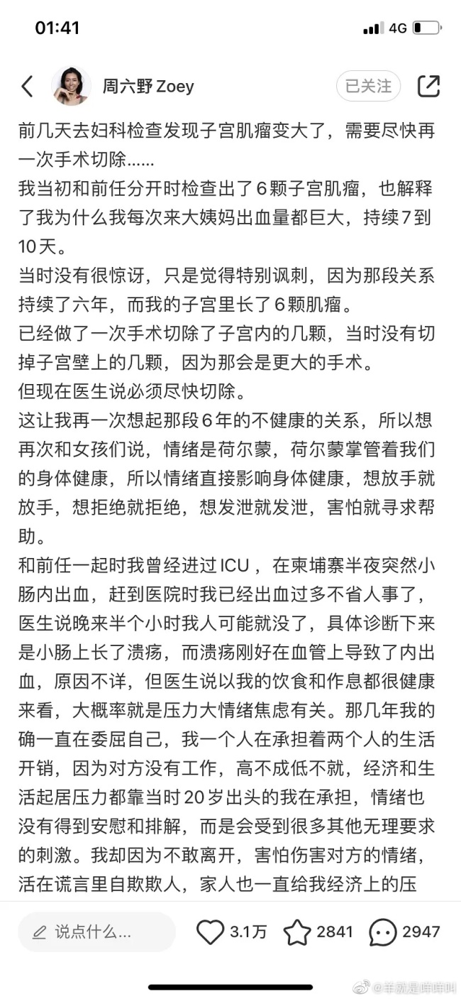 女网红周六野因前男友长六颗子宫肌瘤 事件详解