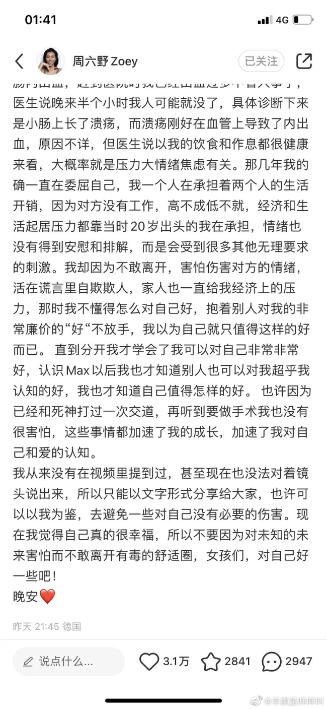 【啥情况?女网红周六野因前男友长六颗子宫肌瘤 ,事件详解】近日,网红周六野在网上自曝因前男友长六颗子宫肌瘤,身体、情绪也越来越不好的事情。并且告诉广大姐妹们“不要因为对未知的未来害怕而不敢离开有毒的舒适圈”。