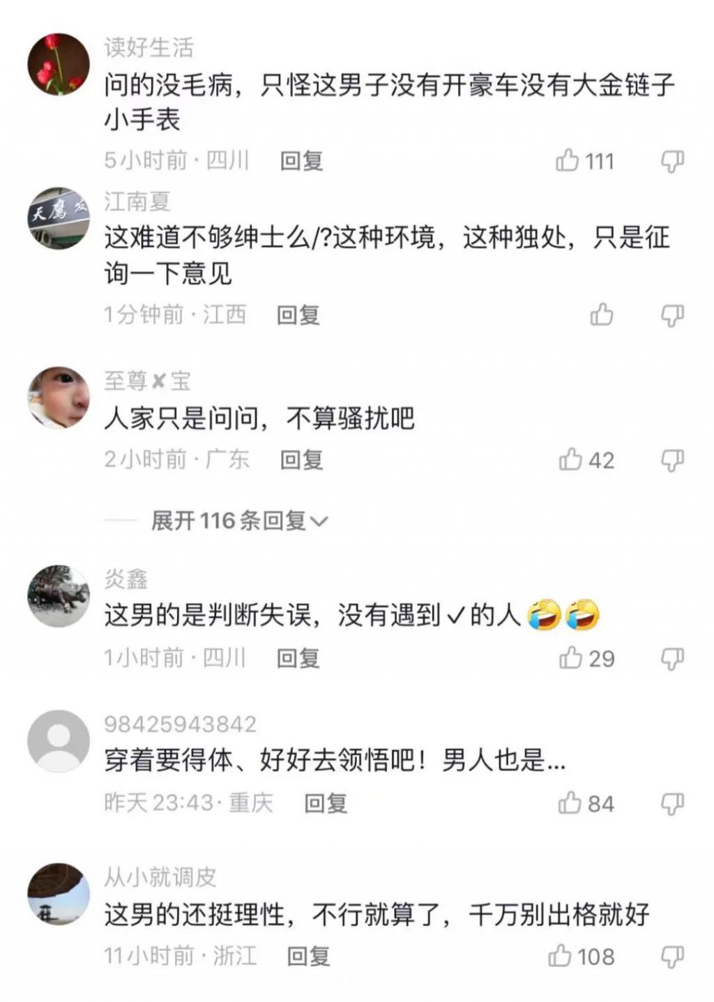 这种完全属于性骚扰的行为,评论区却是一水儿的偏袒男性。给男性用各种理由解释了半天,最后还给女性扣上一个拜金帽子。
