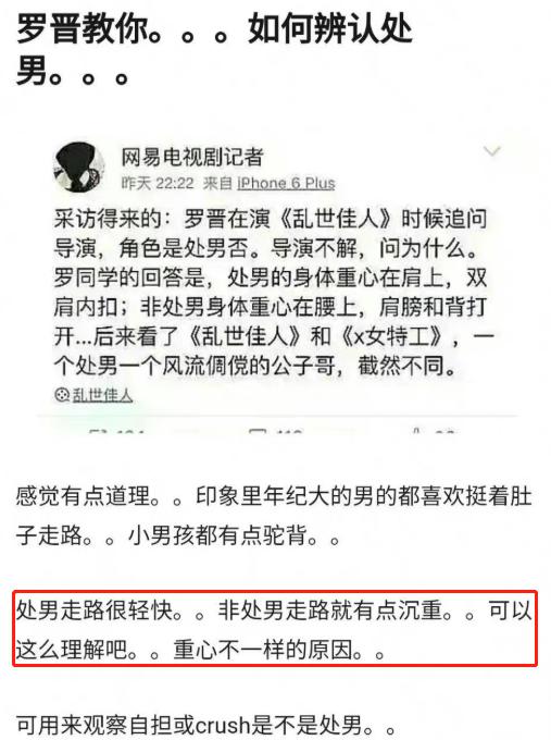 事情是这样的,前两天有网友翻出一段他八百年前的采访片段,说罗晋在演《乱世佳人》时追问导演他这个角色是不是 chu 男。导演不明所以,于是问他问这干嘛,罗晋回答说 "chu 男的身体重心在肩上,双肩内扣。非 chu 男身体重心在腰上,肩膀和背打开。"