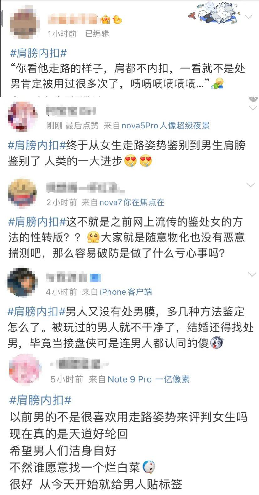 许多在 # 肩膀内扣 # 这个话题中 " 破大防 " 的男性,仅仅是看到这些复制粘贴的垃圾话就受不了,那你们有没有想过在现实生活里当面听到这些垃圾话的女性们的心情呢?