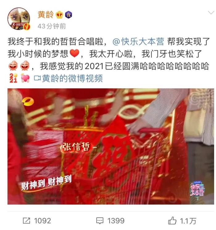 还有更可爱的,在节目结束后,我们的另一位“歌迷”黄龄更是激动地发文称和张信哲合唱开心地门牙都笑松了,像极了小女孩追星时的样子。