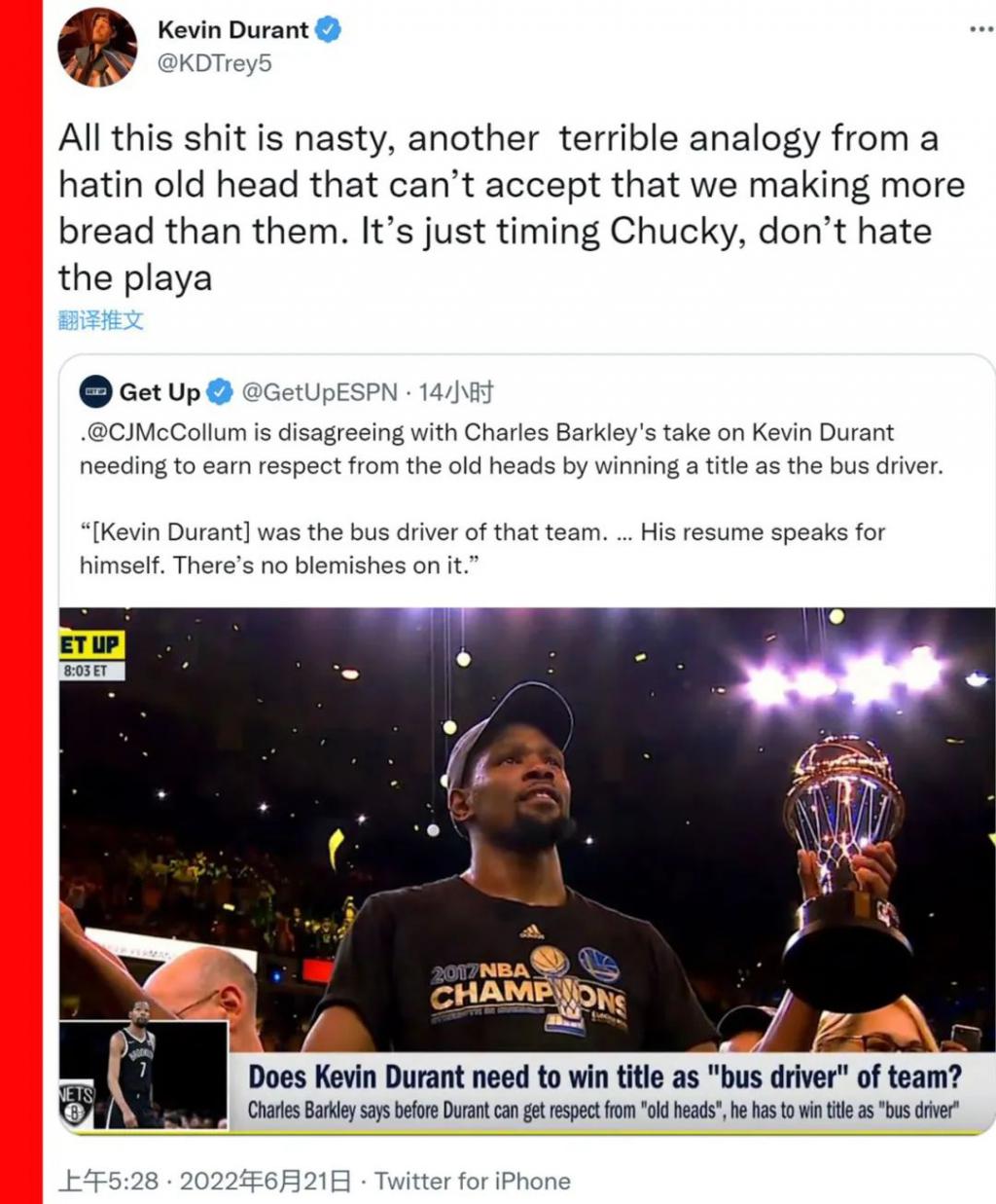 那些头部评论员也借此刺激杜兰特,比如前两天巴克利说,杜兰特必须作为 " 大巴司机 " 去夺一个总冠军。这里的 " 大巴司机 ",意思是团队核心,头号领袖,巴克利暗讽杜兰特那两次夺冠是抱团所得。