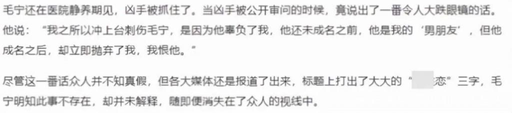 在某次演出结束后,正准备离场的毛宁,被一个人突然摁倒在地,连续捅了 4 刀,毛宁当时就倒在了血泊之中。