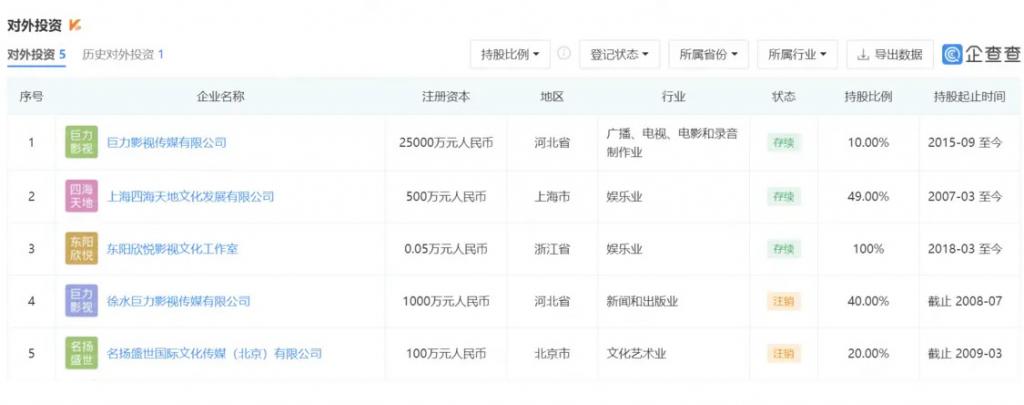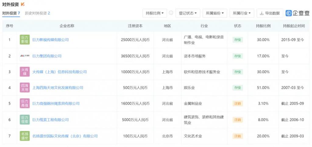 相关平台显示,杨子对外投资的公司目前存续的共有四家。分别是,注册资本 25000 万元的巨力影视传媒有限公司,杨子持股 30%;注册资本 36500 万元的巨力集团有限公司,杨子持股 17%;注册资本 10000 万元的火传媒(上海)信息科技有限公司,杨子持股 30%;注册资本 500 万元的上海四海天地文化发展有限公司,杨子持股 51%。合计金额大约 1.7 亿。