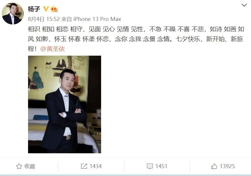再看杨子同一天所发动态:" 相识 相知 相恋 相守,见面 见心 见情 见性,不急 不躁 不喜 不悲,如诗 如画 如风 如影,怀玉 怀春 怀柔 怀恋,念你 念我 念景 念情。七夕快乐,新开始、新旅程!",开头第一句话连起来则是:" 相见不如怀念 ",文末同样艾特了黄圣依。