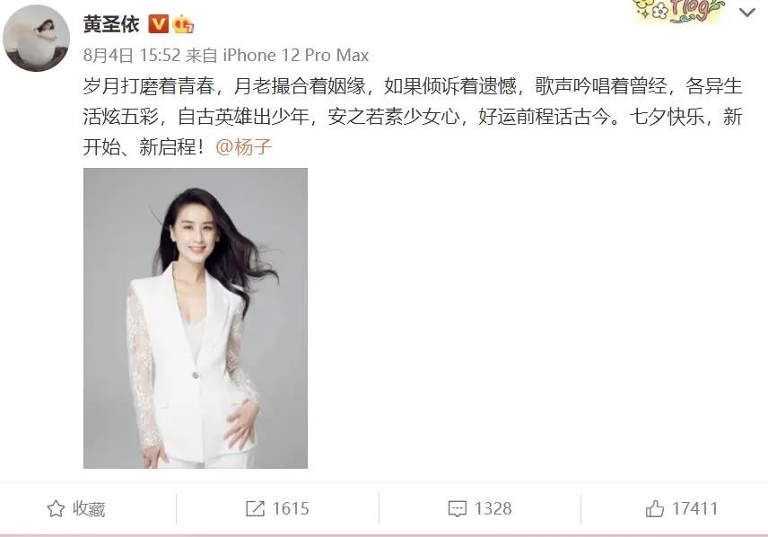先看一下黄圣依发布的内容:" 岁月打磨着青春,月老撮合着姻缘,如果倾诉着遗憾,歌声吟唱着曾经,各异生活炫五彩,自古英雄出少年,安之若素少女心,好运前程话古今。七夕快乐,新开始、新启程!",文末艾特杨子。