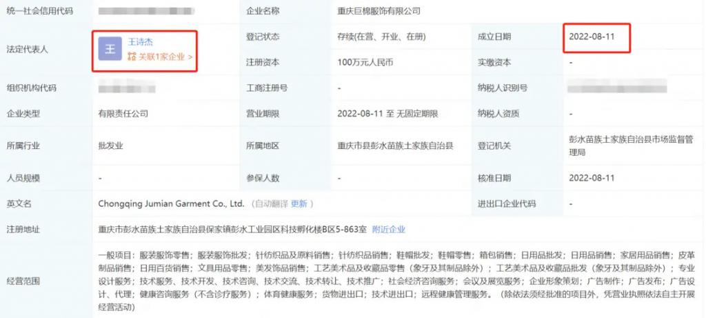 相关信息显示,该品牌隶属于重庆巨棉服饰有限公司,成立于 2022 年 8 月 11 日,注册资本 100 万,法定代表人并非黄圣依。