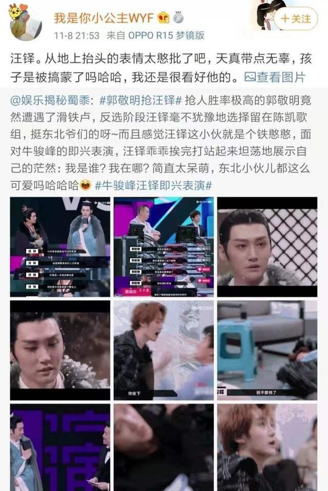 事实上,这个节目中我最欣赏郭敬明的一点,就是他敢说敢做的性格,无论是点评还是抢人他都没有虚与委蛇,能看得到诚恳和实在。我觉得汪铎在节目中的表现也一样的真性情,爽直开朗的性格或许有他天性使然,但面对对手演员的淡定和坦荡也同郭敬明的风格如出一辙。和种子选手牛骏峰即兴表演时,汪铎毫不畏惧,配合着搭档的节奏展开,即便是被拖着挨打也没有破坏氛围,这可能就是专业演员不顾偶像包袱、执着投入的见证吧。
