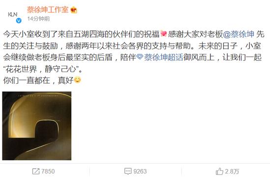 7月21日是蔡徐坤成立工作室两周年的纪念日,工作室发文感谢粉丝:“今天小室收到了来自五湖四海的伙伴们的祝福,感谢大家对老板的关注与鼓励,感谢两年以来社会各界的支持与帮助。未来的日子,小室会继续做老板身后最坚实的后盾,陪伴蔡徐坤御风而上,让我们一起‘花花世界,静守己心’。你们一直都在,真好。”
