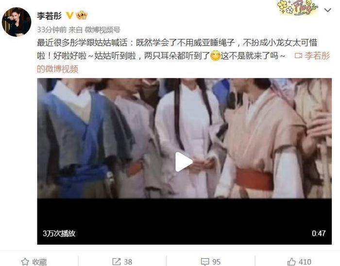 李若彤发文:最近很多彤学跟姑姑喊话:既然学会了不用威亚睡绳子,不扮成小龙女太可惜啦!好啦好啦~姑姑听到啦,两只耳朵都听到了,这不是就来了吗~