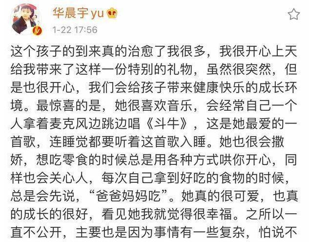 自从承认自己有女儿并且在文中对孩子大肆赞美,华晨宇也立足了好爸爸的人设,粉丝甚至期待将来能看到他带着女儿上节目。由于消息曝光之后,很多网友对女方的声明抱着怀疑的态度,再加上一些网友对华晨宇的质疑,很多人不免替张碧晨感到委屈,都生了孩子还是不能成功上位,作为一个实力派女歌手实在太不值得!不知道大家对这件事怎么看?