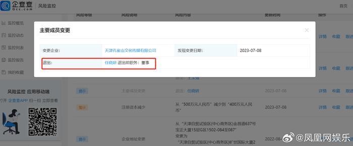 #王宝强退出孔雀山传媒公司#【#王宝强及经纪人退出孔雀山传媒#】企查查APP显示,近日,天津孔雀山文化传媒有限公司发生工商变更,王宝强退出该公司股东行列,退出前持股比例为5%,同时王宝强经纪人任晓妍卸任该公司董事职务。企查查信息显示,天津孔雀山文化传媒有限公司成立于2016年3月,法定代表人为柳权,注册资本400万元,拥有《地球上的星星》作品著作权。公开信息显示,该公司曾计划推出中印合拍电影《私奔到中国》、《阿辛哥的奇妙之旅》。