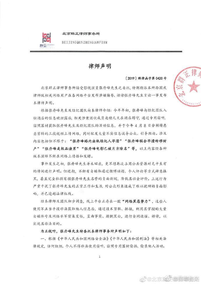 张丹峰工作室发声明澄清“出轨经纪人毕滢”传言,表示已向法院提起诉讼,并接连逐条否认。