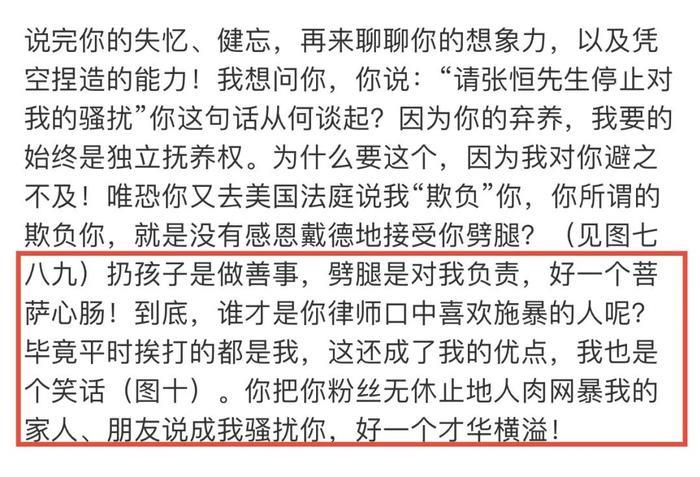 还原了弃养的全过程之后,张恒还提到了税务和天价片酬。他反问:“你收到钱后手舞足蹈的样子忘记了?”