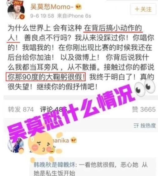 而在退出前,吴莫愁与昔日好闺蜜张碧晨反目成仇,让人猜忌是她退圈内情。当时,吴莫愁曾在社交平台上发表声明,称别人在后面搞她的动作,还说碰到你的人都说你90度大鞠躬礼是假的。虽然没有直接称呼对方的名字,但是90度大鞠躬礼一直是张碧晨的标志,而且她的舞蹈动作也不和谐,吴莫愁这条新浪微博都提到了这两个方面,而且她的舞姿也不太好,这一点是在微博上提到的。