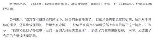 11月23日,据韩媒报道, 1990年出生的演员朴信惠,将于明年1月22日完婚,男方是同为演员的崔泰俊,比朴信惠小一岁,相恋将近5年,目前朴信惠已怀孕,真是双喜临门!媒体透露朴信惠现阶段处于怀孕初期,需要多加小心,珍惜新生命的到来,双方表示婚礼将不公开小范围举办,只邀请亲友到场。