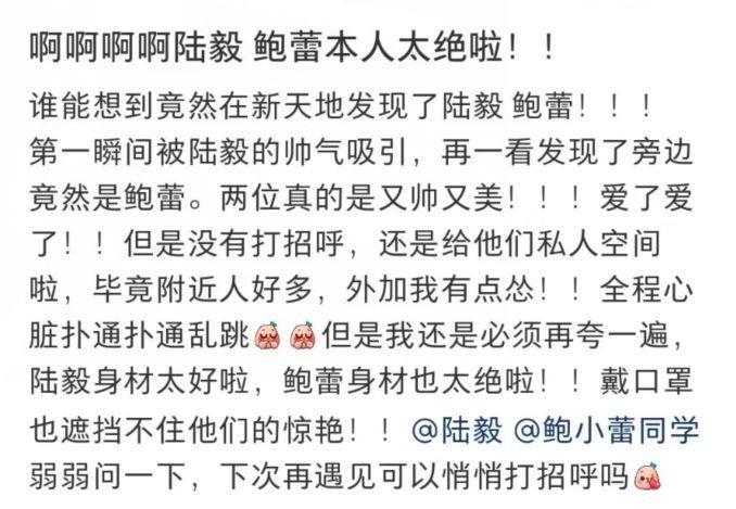 该网友透露,没想到逛个街还能偶遇到明星,第一眼看到了陆毅,被他的帅气吸引,再一看旁边竟然是爆料,两人真是又帅又美。由于是私人时间,并没有上去打扰他们,现场的人也很多,有些不好意思。