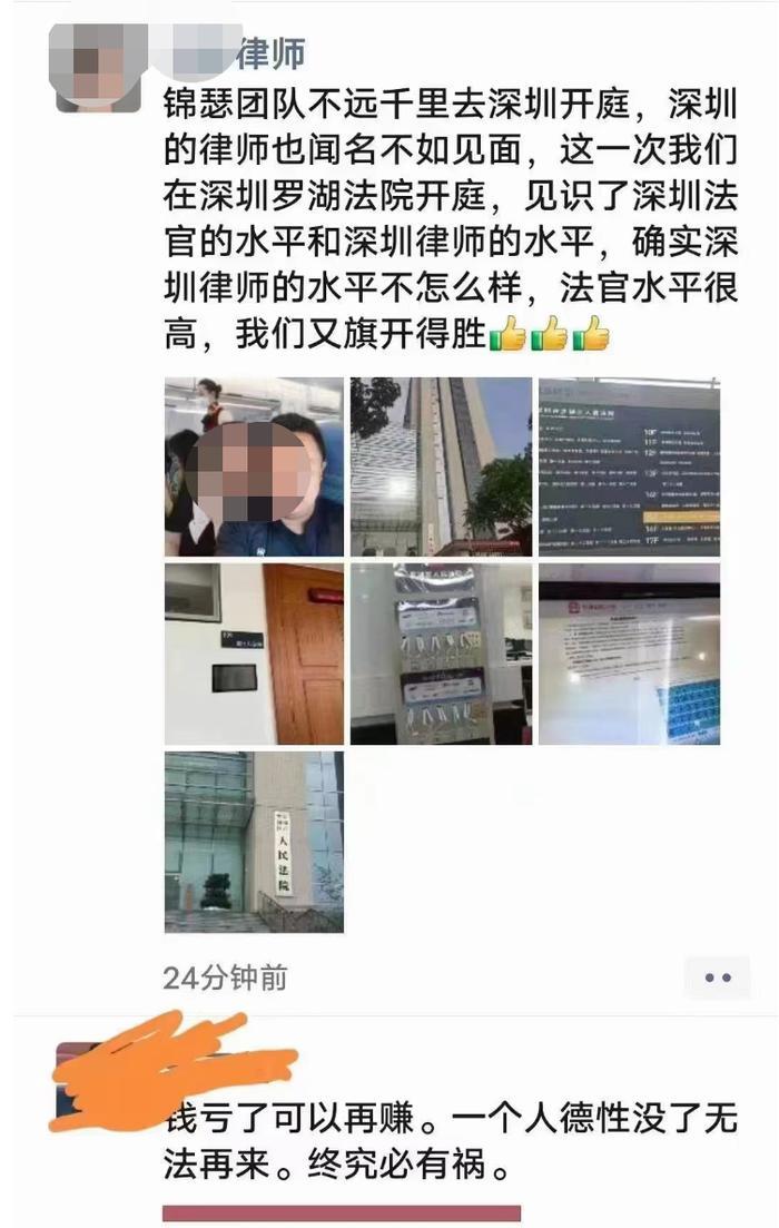 昨天八姐还想呢,律师怎么可以这么卷,今天又有律师给八姐整了一个活儿,一位成都的婚姻相关的律师,去了深圳打了一场官司,在朋友圈表示:锦瑟团队不远千里去深圳开庭,深圳的律师也闻名不如见面,这一次我们在深圳罗湖法院开庭,见识了深圳法官的水平和深圳律师的水平,确实深圳律师的水平不怎么样,法官水平很高,我们又旗开得胜。