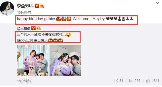 随后李亚男转发王祖蓝的博文,为gabby送上生日祝福“happy birthday gabby Welcome Hayley ”,小女儿英文名曝光,特别大方公开宝贝的信息。