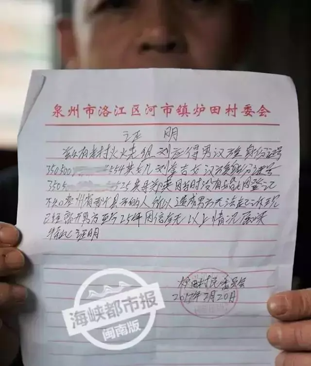 刘先生说:“我们是事实婚姻没错,不过她的离开也是事实,村里也开了证明。如果一辈子不能登记,我就这样孤苦伶仃了。”
