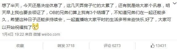 在昨天晚上,北京时间1月4日,YYF也在微博中宣布自己将在今天与女友领证结婚,结束爱情长跑。这么多年YYF的感情生活一直处于严格的保密状态下,圈内人包括OB众人也很少会提及枫哥的私人生活,如今微博播出喜讯也让很多粉丝羡慕不已,在此我们也恭喜大枫哥,祝福他新婚快乐,阖家欢乐。