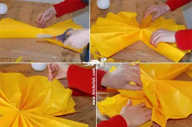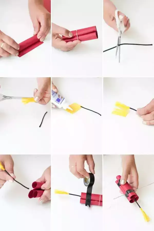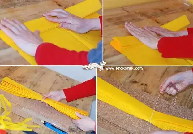 准备材料:黄色彩纸、线、黑色胶带、剪刀