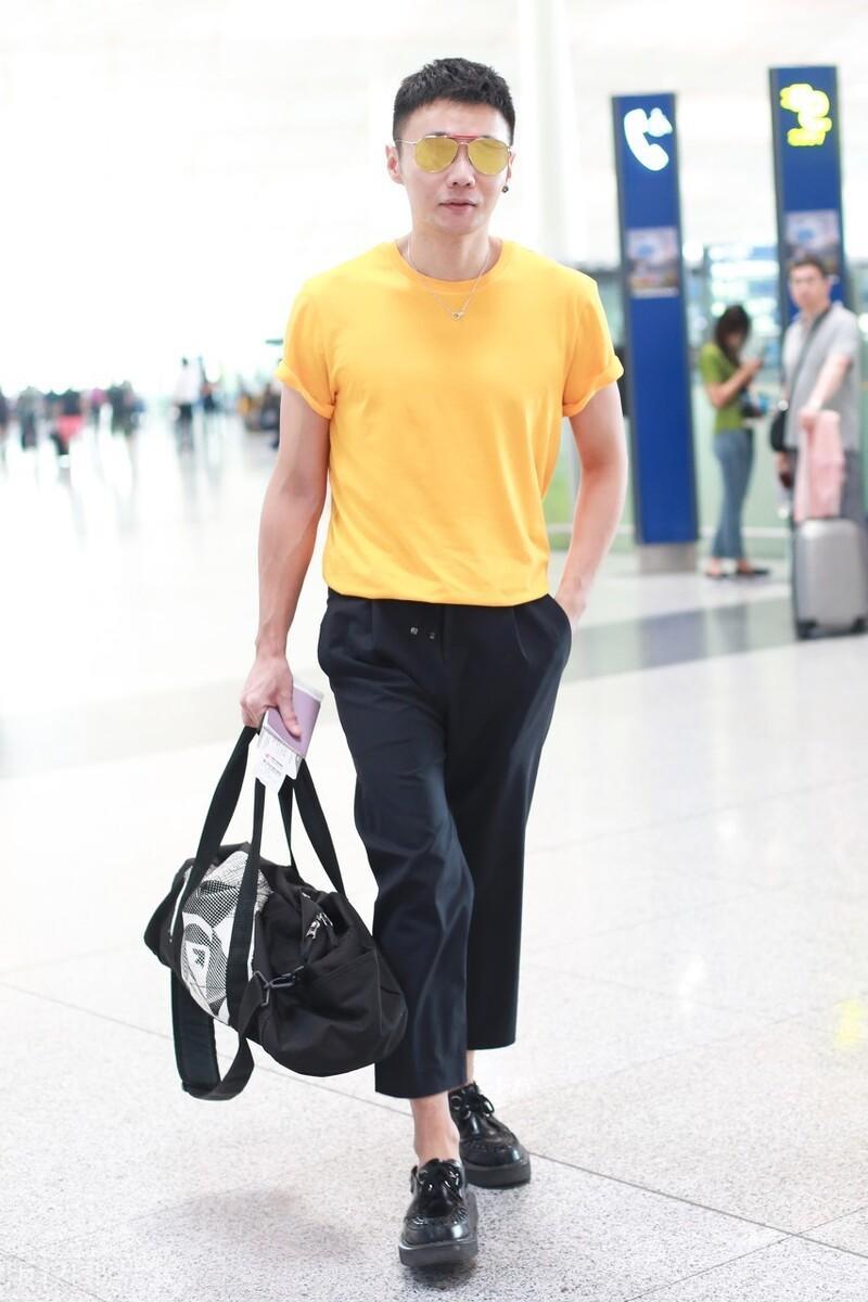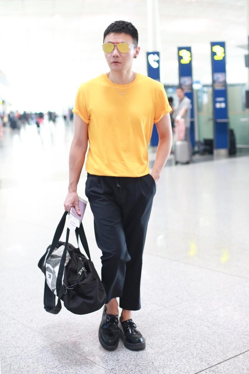 这一身也是李荣浩以往的出行搭配,看起来大同小异,搭配方式上没有什么大变化,只是将T恤款式换了而已,李荣浩选择纯暖黄色的款式来搭配,造型确实更为醒目提神,但是束腰的效果依然能够给人利落干练的感受,这就是塞衣角搭配的好处了,不管T恤款式如何改变,当塞衣角搭配后总能给人一种不过随意的效果。