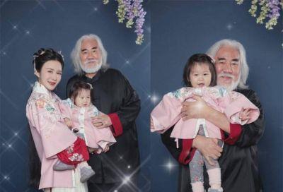 张纪中娇妻穿汉服抱小女儿,一家四口同框似爷孙