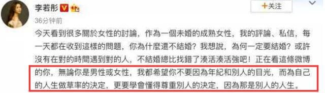 李若彤说作为一个大龄熟女,总是会被各种私信询问:为什么不结婚?可没有人规定女人必须要结婚生子,若是太在意世俗的看法,也许过的并不开心。她希望大家不要在意其他人的看法,尊重自己的内心,轻松自在地活着。