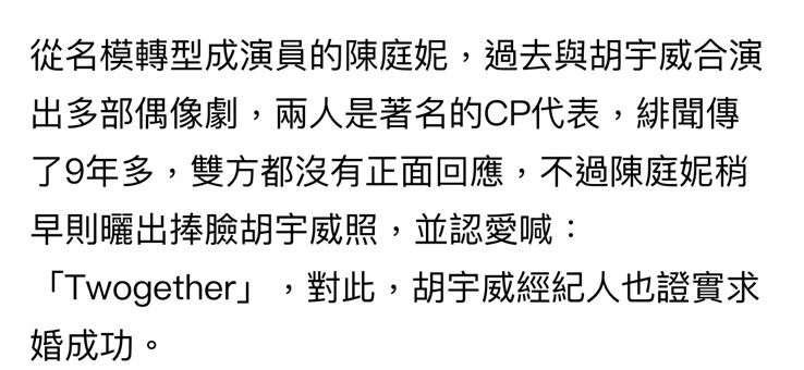 胡宇崴与陈庭妮的绯闻传了10年,当时他们拍完戏后互动很甜,不少人就怀疑两人在谈恋爱,但他们从未回应恋情传闻。如今首度回应便是结婚的消息,一时之间让很多cp粉狂喜。