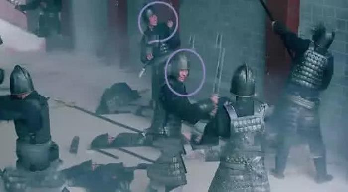 两军交战惨烈无比,可是这两位兵哥竟然一边打一边笑。嗨,群演小哥,镜头来了还不严肃点,咋一点镜头感也木有涅。