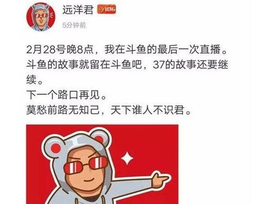 昨天晚上,户外主播“远洋君”发布了一条微博,称本月的28日将会是在斗鱼的最后一次直播,那斗鱼远洋君为什么不直播了?其实斗鱼远洋君说了要离开斗鱼了,大家都在猜测斗鱼远洋君要去哪里,下家是谁?