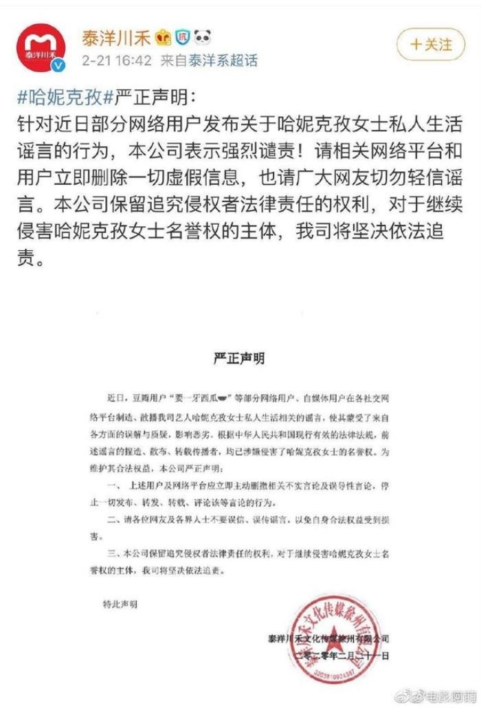 21日哈妮克孜的经纪公司怒发声明,针对外界的谣言表示谴责请求删除一切虚假信息,准备要追究造谣者的责任。哈妮克孜本人也转发了这条声明表明了自己的决心,许多网友对此也表示支持,对于造谣者的恶行实在忍无可忍。