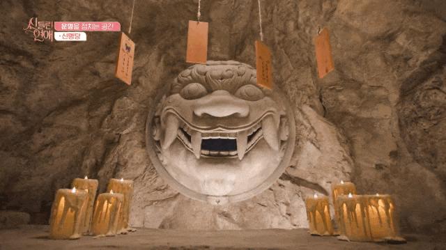 堂内摆放一尊巨大神像,上方悬挂着写有异性嘉宾生辰八字的【命运牌】。
