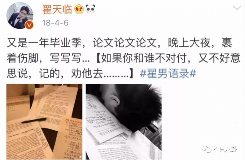 翻看翟天临的微博会发现,虽然多数时间他都在拍戏,但是拍戏空余时间他经常会晒出自己努力学习赶写论文的日常。