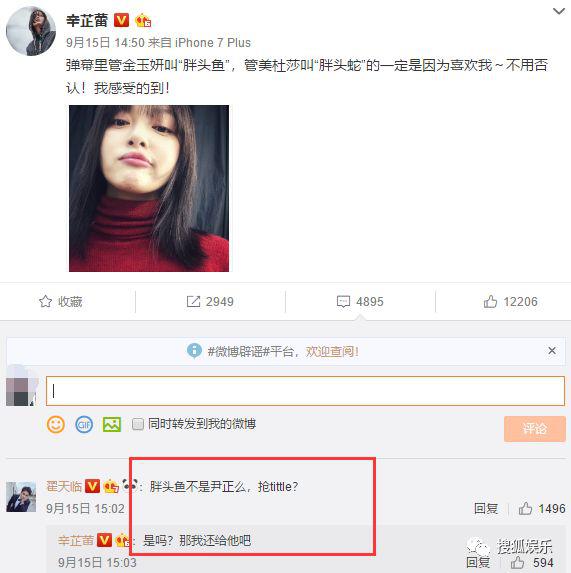 辛芷蕾曾发微博说弹幕里管金玉妍叫"胖头鱼"一定是因为喜欢她。翟天临就火速评论,称胖头鱼是自己好基友尹正的外号。