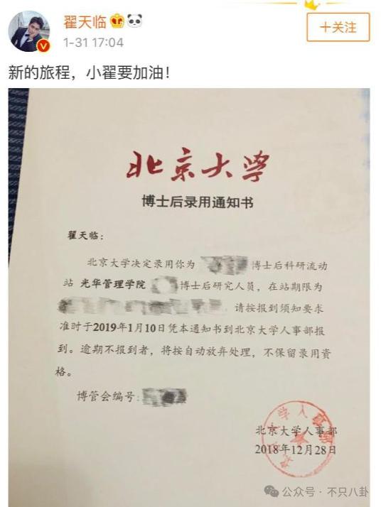 另外,当年1月他还晒了被北大录取的博士后通知书,老骄傲了!那一年的他,可谓春风得意马蹄疾哇!