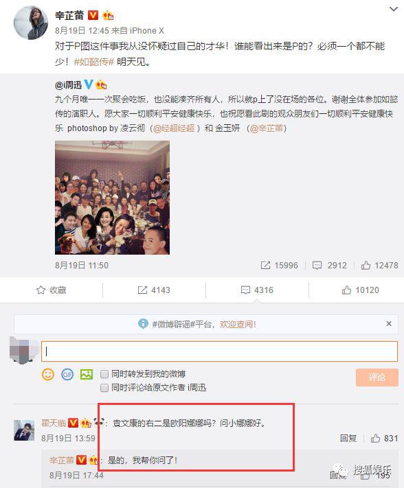辛芷蕾发《如懿传》剧组的大合照,翟天临就跑过来说自己认出了欧阳娜娜,还说"问小娜娜好"。