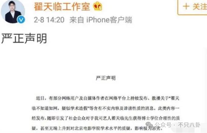 翟天临工作室也发文声明,表示是在跟网友开玩笑,有人在诽谤。