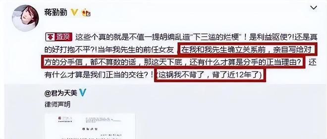 已经是两个孩子妈妈的蒋勤勤,发文自证清白,并发了律师信。