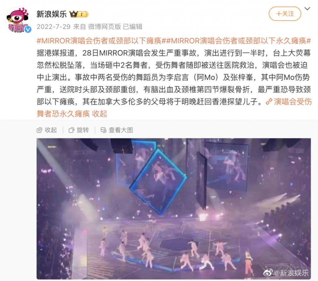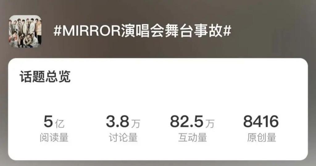 随后主办方紧急叫停了 MIRROR 剩下的 8 场演出,"MIRROR 演唱会舞台事故 " 也迅速登上微博热搜,话题阅读量高达 5 亿。