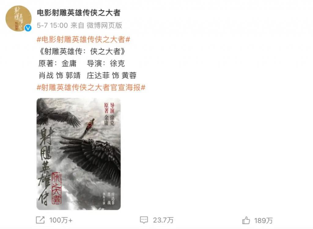 去年五月份,徐克重归江湖的电影版 " 射雕 " 正式官宣,其中,她搭档顶流饰演黄蓉。