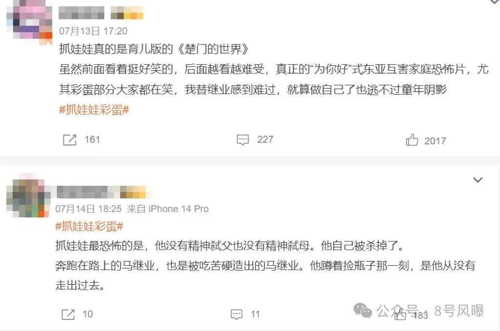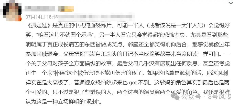 《抓娃娃》中的许多情节,让不少观众看完电影后表示,该片虽说是喜剧电影,但其内核是东亚家庭互相伤害的 " 恐怖片 "。