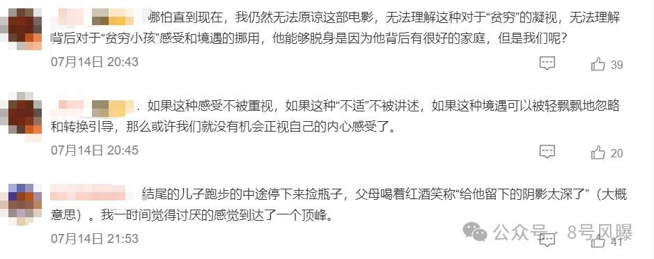 还有网友评论说,无法理解电影当中对于贫穷的凝视,无法理解背后对于 " 贫穷小孩 " 感受和境遇的挪用,马继业能够脱身是因为他背后有很好的家庭,但普通人却并非如此。