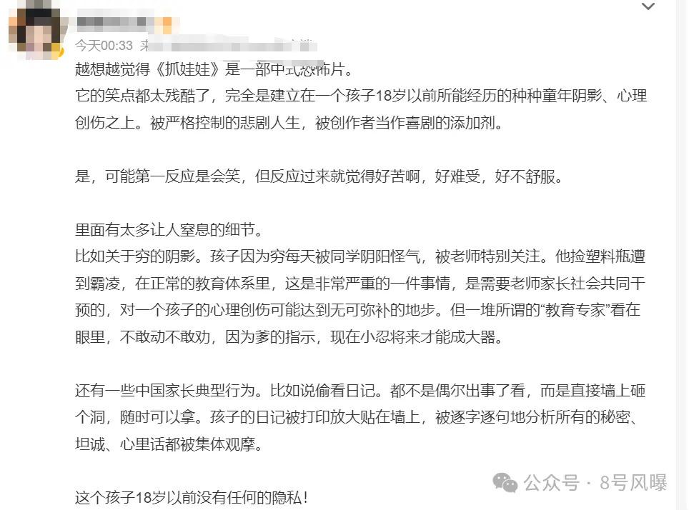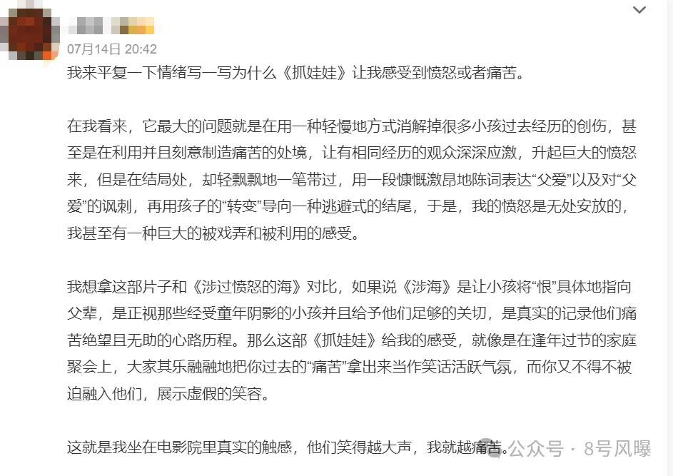 " 电影最大的问题就是用一种轻慢的方式消解掉很多小孩过去经历的创伤,甚至是在利用并且刻意制造痛苦的处境,让有相同经历的观众深深应激,升起巨大的愤怒 "。