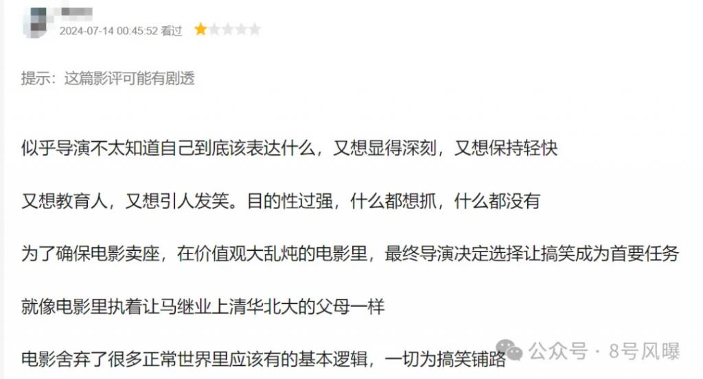 有网友表示:似乎导演不太知道自己到底该表达什么,又想显得深刻,又想保持轻快,又想教育人,又想引人发笑。目的性过强,什么都想抓,什么都没有,甚至为了卖座舍弃了很多基本的逻辑,一切只为搞笑铺路。
